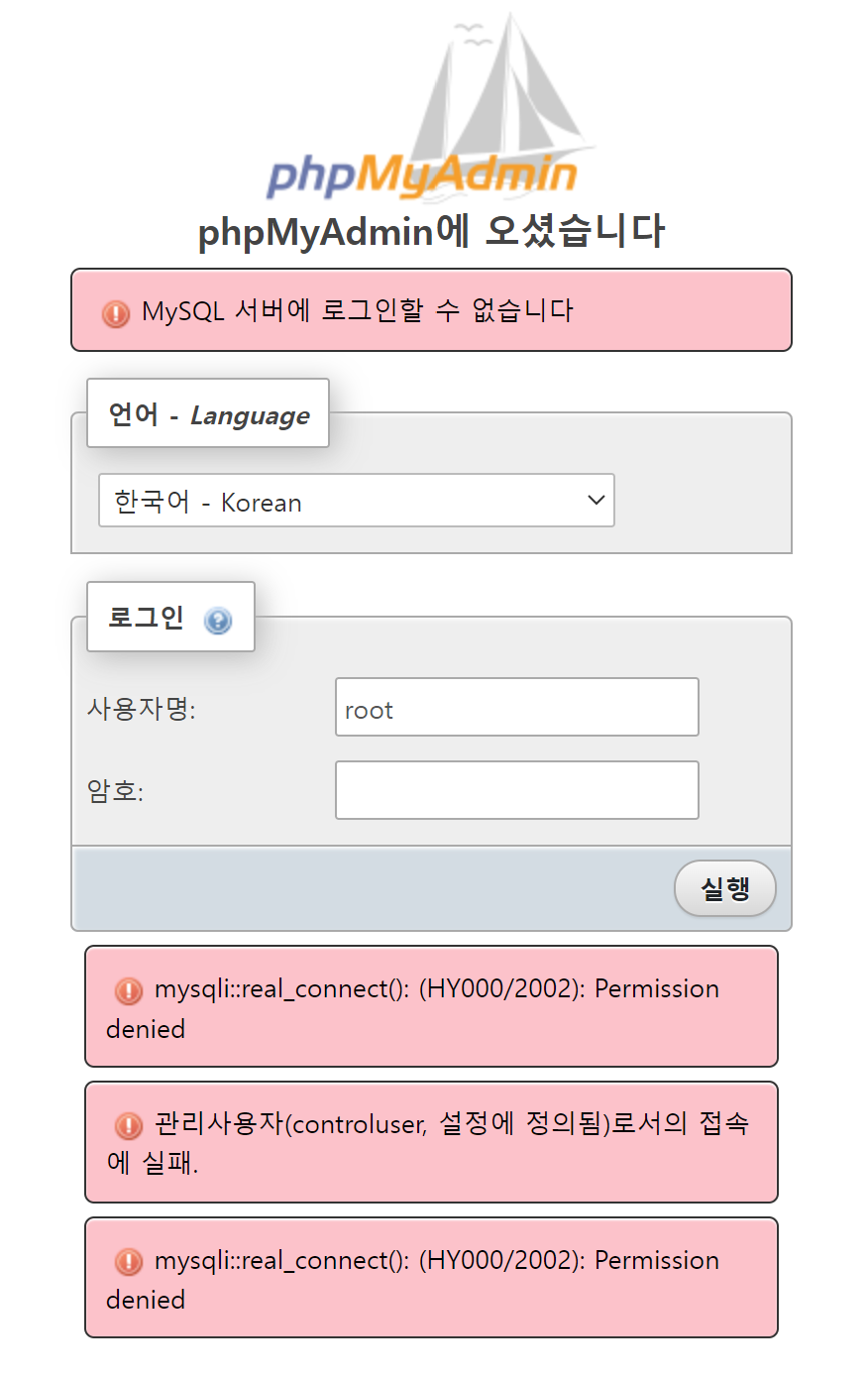 phpmyadmin 실행 시 위와 같은 오류가 발생 시 해결 방법