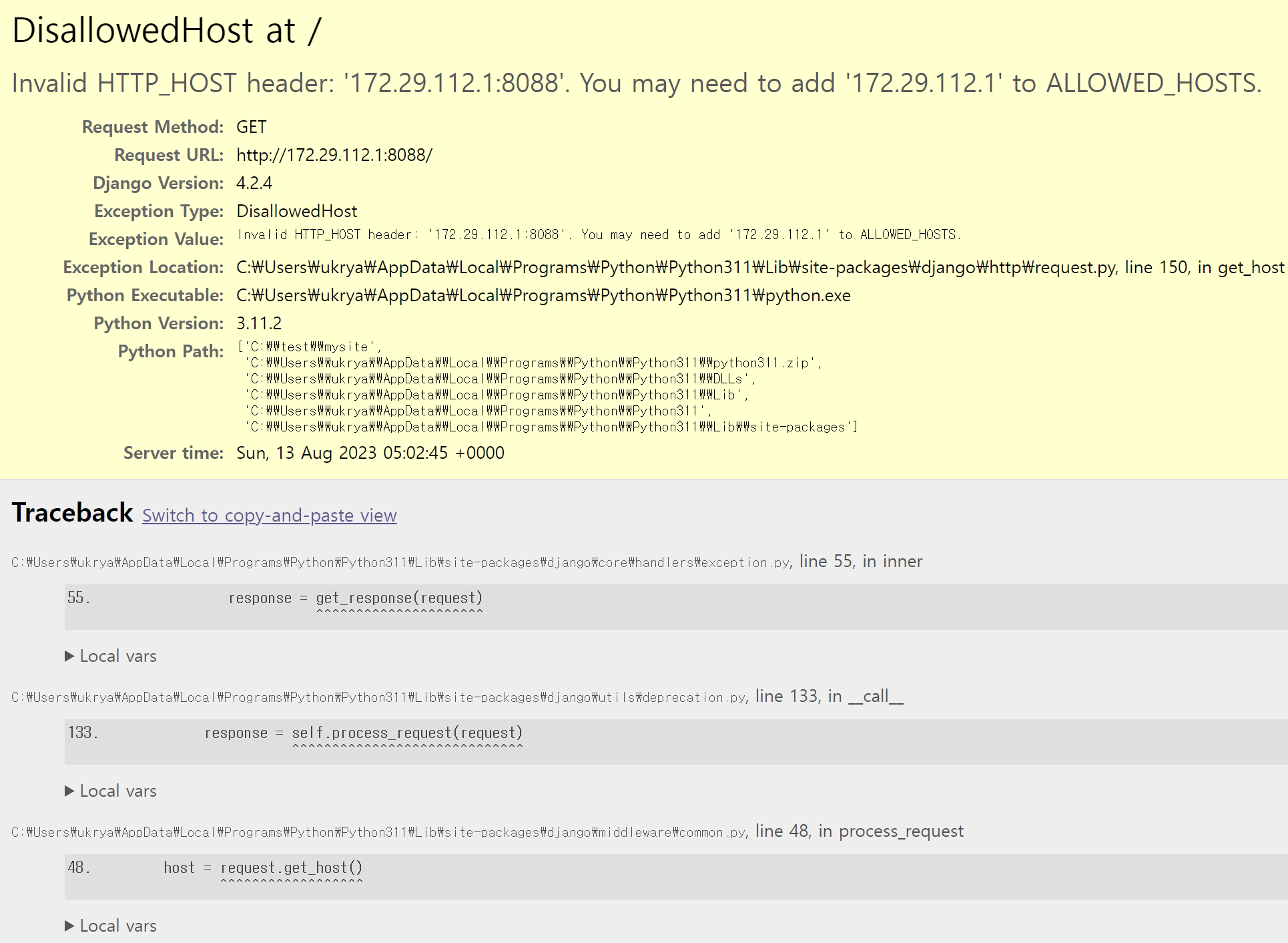 settings.py 파일을 수정해줍시다. (ALLOWED_HOSTS = [] -> ALLOWED_HOSTS = ['*])
