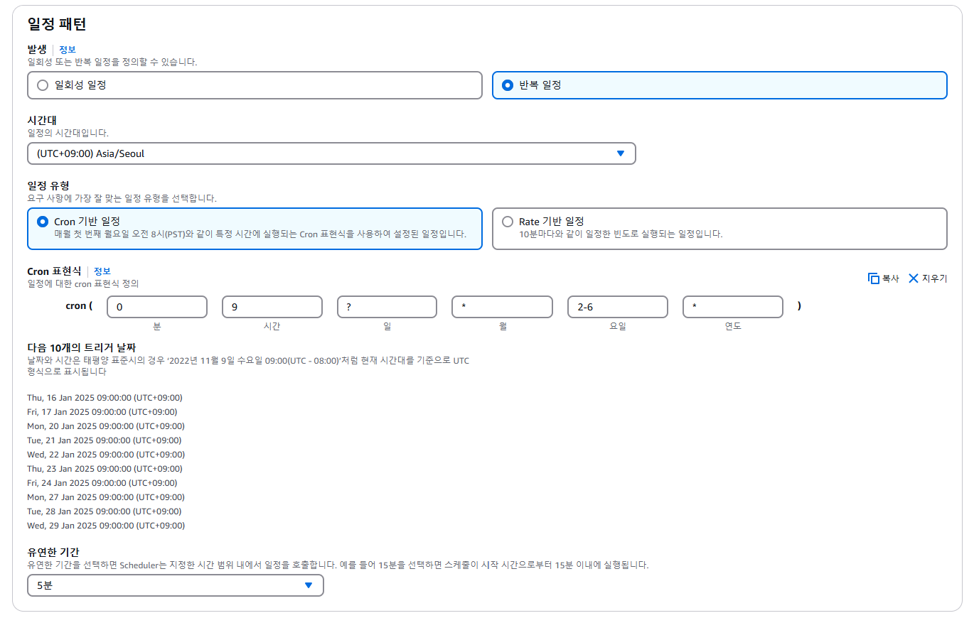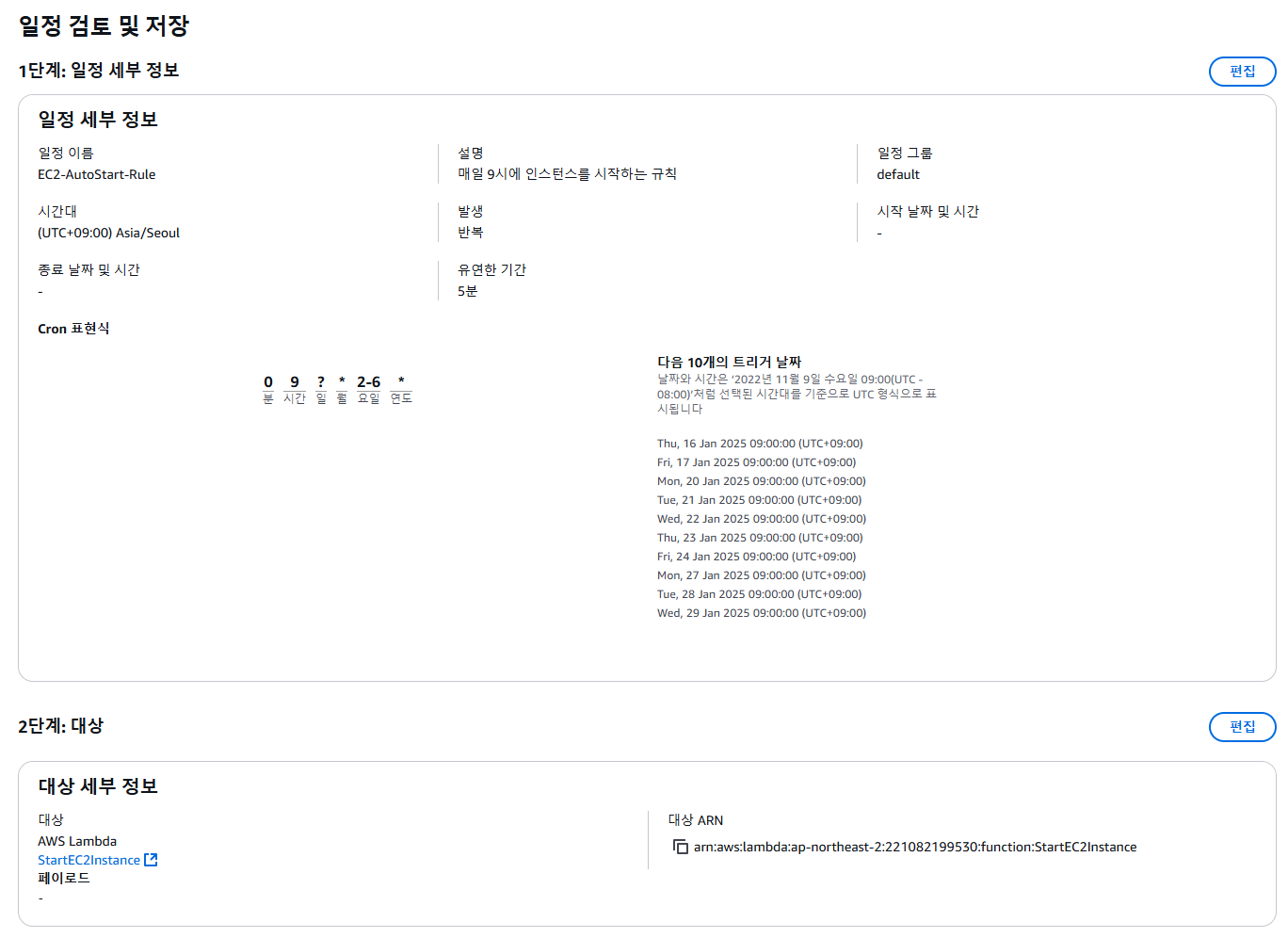 - 일정 세부 정보 설정 (Cron 표현식에 맞춰서 표현식을 정의 합니다. - 참조: https://crontab.guru/) // 인스턴스 시작은 평일에만 진행합니다.