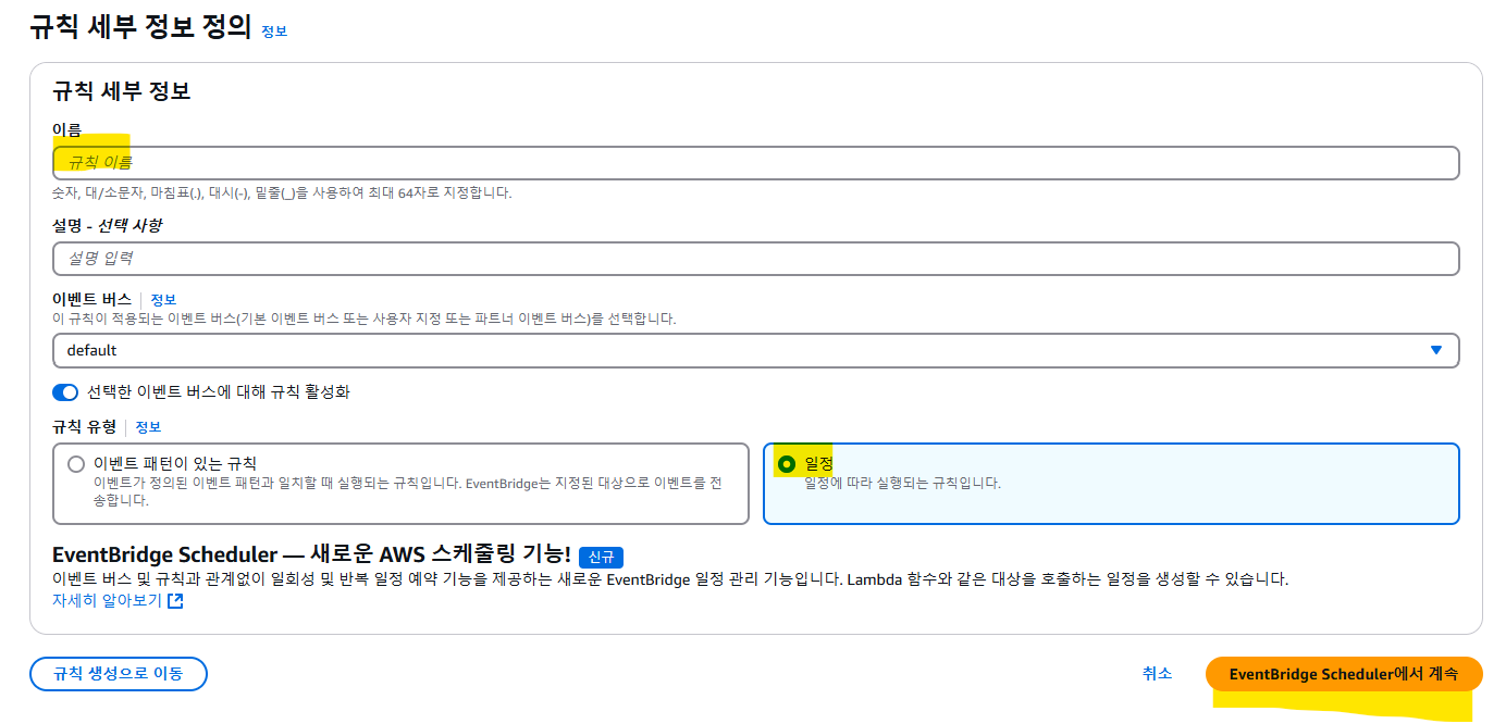 - EventBridge -> 규칙 선택 후 아래와 같이 정보 입력 (EC2-AutoStart-Rule)