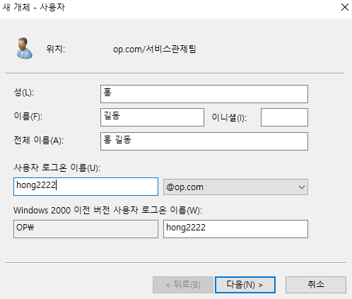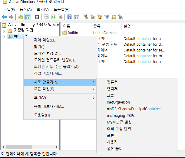 : 자신의 도메인 오른 쪽 클릭 후->새로 만들기->조직 구성 단위