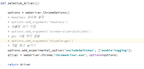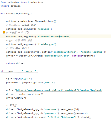 - selenium 라이브러리에서 webdriver 함수를 import 해줍니다. - getpass는 보이지 않는 입력을 받기 위해 사용하였습니다. - selenium에서 Chrome 자동화 작업 시 필요한 옵션들을 설정하였습니다. - 실제 프로그램 동작과 연관이 없는 Error 내용 삭제를 위해 개발 로그를 숨기기 위한 옵션을 추가하였습니다. - webdriver.Chrome('Chromedriver.exe 위치', options=options) // Chromedriver 위치와 설정한 옵션 연결 - driver = selenium_driver() // 현재까지 설정한 Selenium 옵션들을 drvier 변수에 연결 - driver.get(url) // 자동화 작업을 진행하고자 하는 Web 사이트 연결