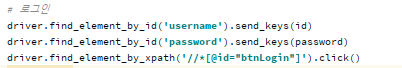 # Login 정보 입력 - find_element_by_id('username').send_keys(id) - find_element_by_id('password').send_keys(password)