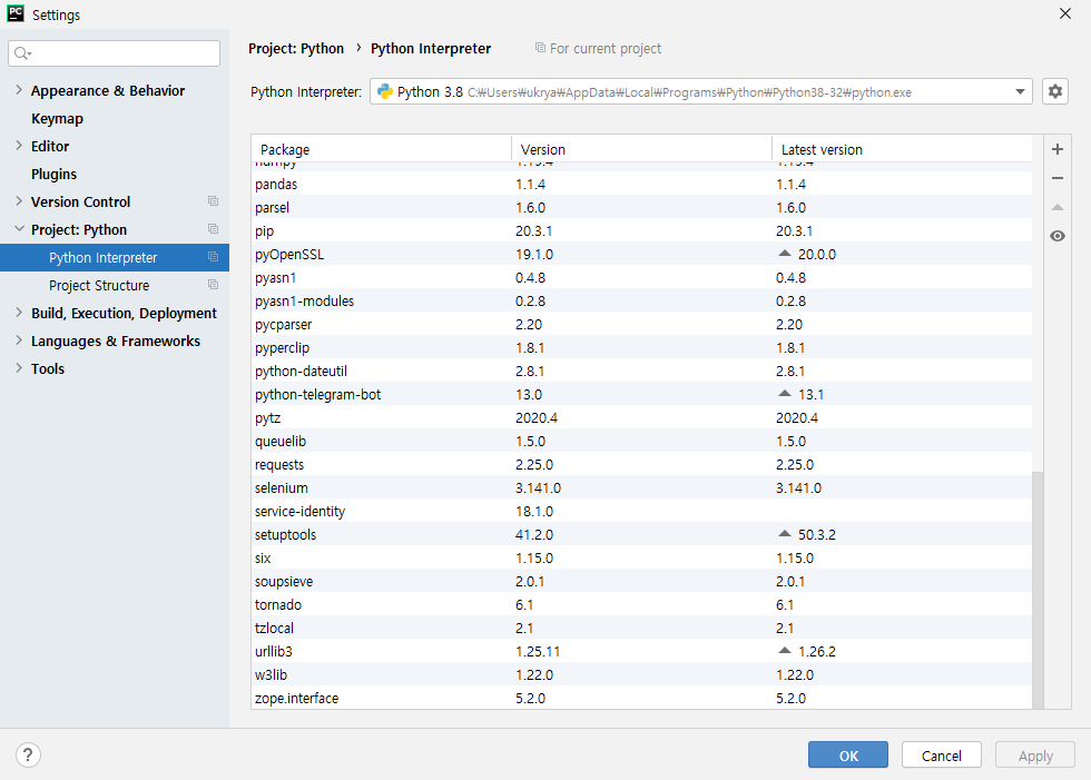 - PyCharm 실행 - File-Settings-[Project: 파이썬 실행할 프로젝트 이름]-Python Interpreter - 위의 사진 같이 볼 수 있는데 제 인터프리터 경로를 보시면 아까 Powershell에서 보신 경로와 동일합니다. - 그렇기 때문에 위와 같이 사용 가능한 Package 목록에 selenium 라이브러리가 있는 것을 보실 수 있습니다.