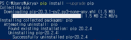 - Powershell 실행 > python >>> import sys >>> sys.executable - 저는 3.8.1 버전을 사용하고 있습니다. - 현재 Python 공식 사이트 기준 3.9.0 버전까지 출시가 된걸로 확인이 됩니다. >>> Ctrl+Z >>> Enter //Python 쉘 종료 - 설치 전 pip를 최신 버전으로 업그레이드 시켜 줍니다. > pip install --upgrade pip