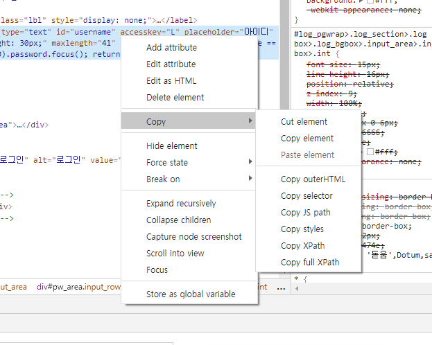 - 위의 사진처럼 나오실텐데 여기서 화살표 버튼을 눌러 Element를 얻기위한 부분 클릭 - 그러면 위의 사진처럼 선택된 부분의 Element가 블록 표시가 됩니다. - 오른쪽 버튼 클릭 - Copy - 종류 선택