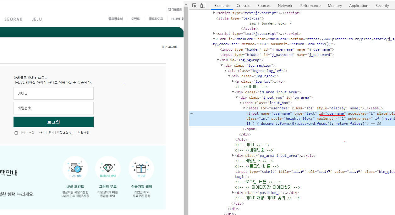 # Element를 찾기 위한 ID 정보 구하기 - 아래 그림의 ID 정보 확인(빨간줄) # Element를 찾기 위한 Xpath 정보 구하기 - Selenium을 이용하고자 하는 사이트 접속 - F12 // 개발자 도구 실행 - 테스트 사이트: https://www.plazacc.co.kr/plzcc/irsweb/golf2/member/login.do