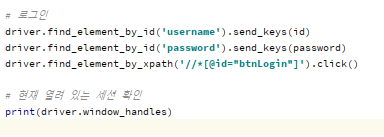 - while문을 사용하여 세션을 이동 후 가장 아래 세션(window_handles[0]) 제외하고 종료해줍니다.