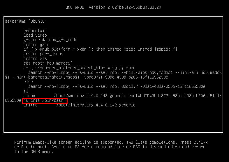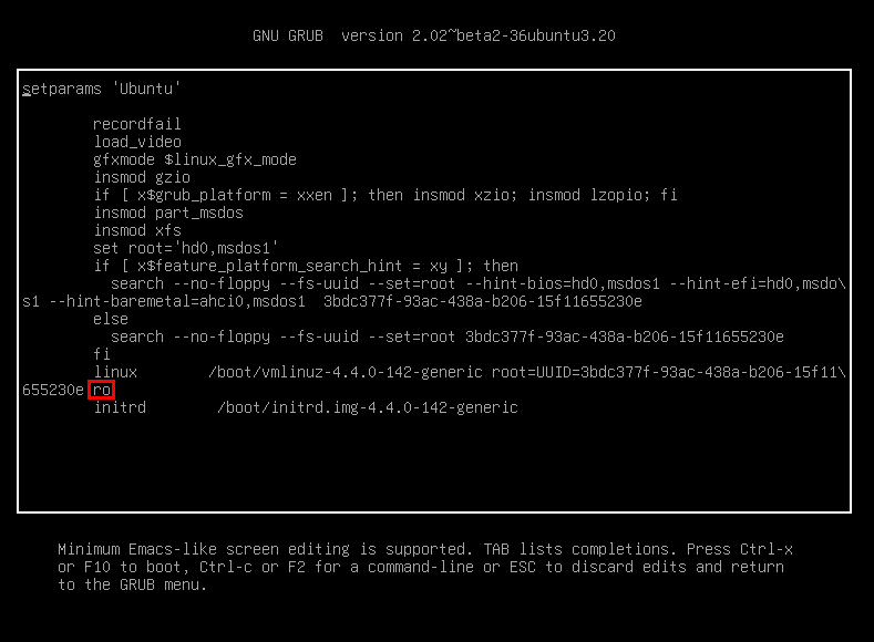 - ro -> rw init=/bin/bash 로 변경 해줍니다.