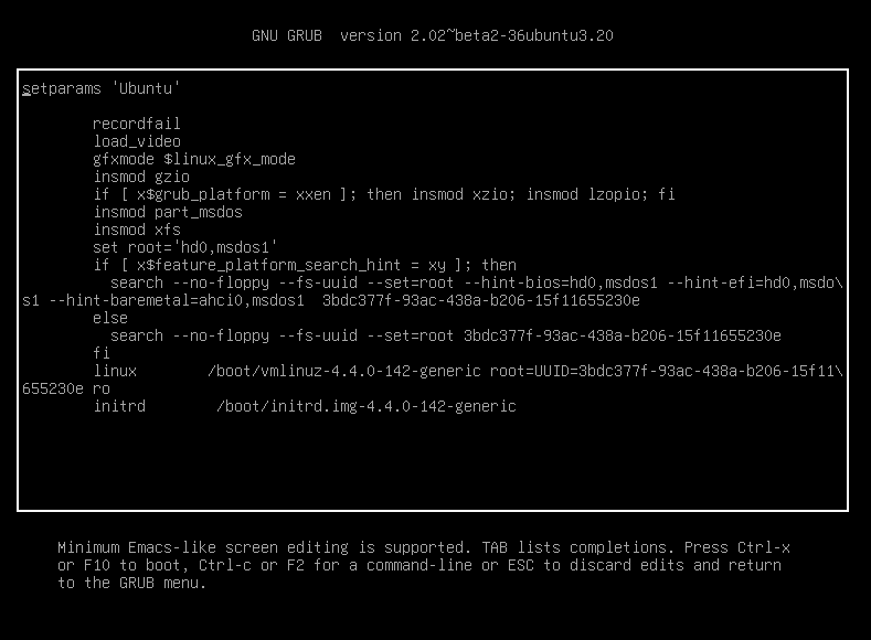 - 싱글 모드 부팅을 위해 부팅 중 'e' 키를 눌러 Grub 설정 모드로 접속합니다.