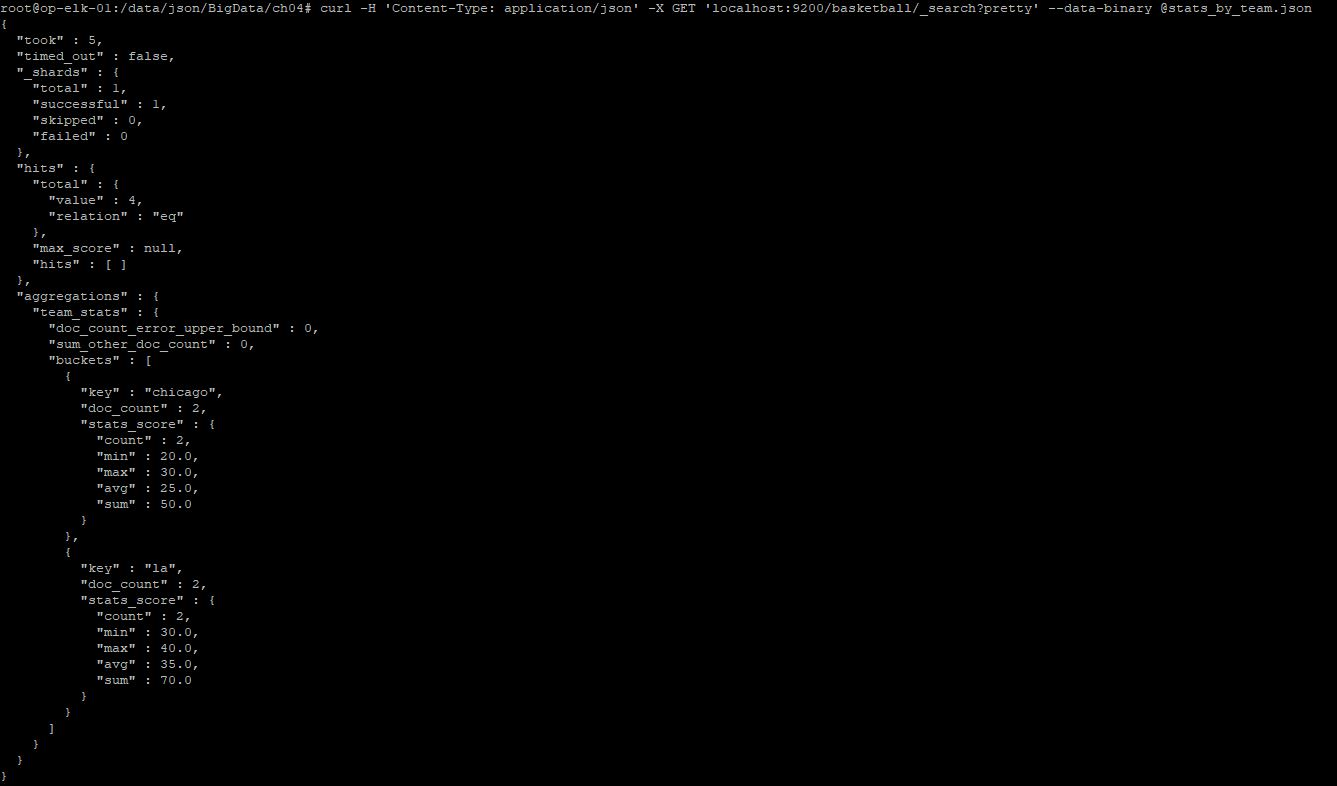 - 결과값 확인 # curl -H 'Content-Type: application/json' -X GET 'localhost:9200/basketball/_search?pretty' --data-bianry @stats_by_team.json