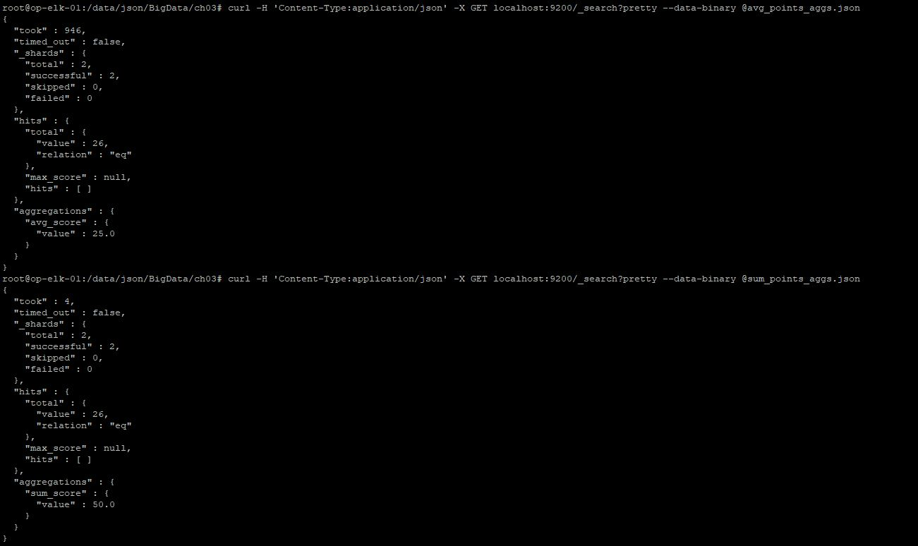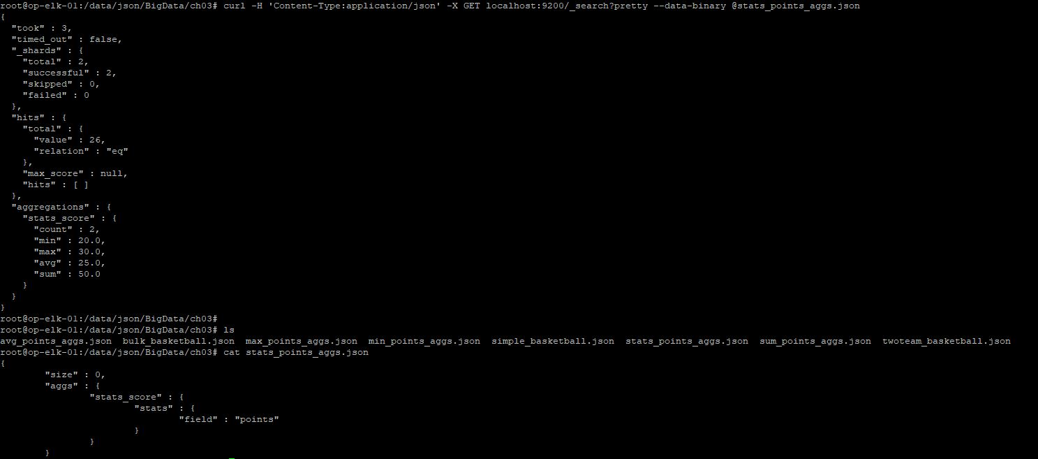 ex) stat 데이터 출력 # vim score_agg_test.json . . . { # 결과 값만 출력 "size" : 0, # aggregation 선언 "aggs" : { # 이름 "stats_score" : { # aggregation 연산 값 # stats: 전체 출력 / max, min, avg 등... 사용 가능 "stats" : { # 필드 선택 "field" : "points" } } } } . . . : wq