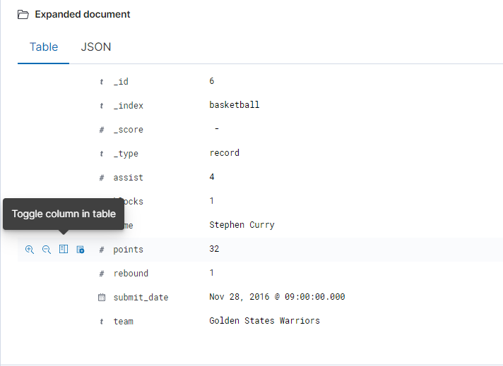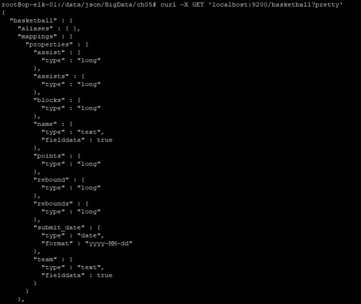 { "record" : { "properties" : { "team" : { "type" : "text", "fielddata" : true }, "name" : { "type" : "text", "fielddata" : true }, "points" : { "type" : "long" }, "rebounds" : { "type" : "long" }, "assists" : { "type" : "long" }, "blocks" : { "type" : "long" }, "submit_date" : { "type" : "date", "format" : "yyyy-MM-dd" } } } }