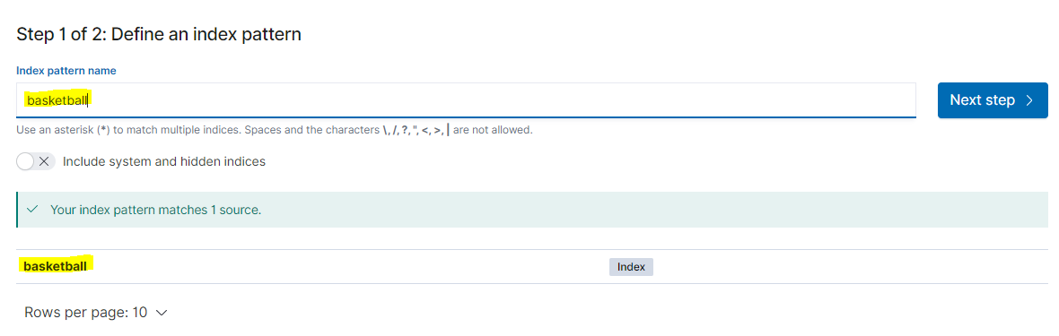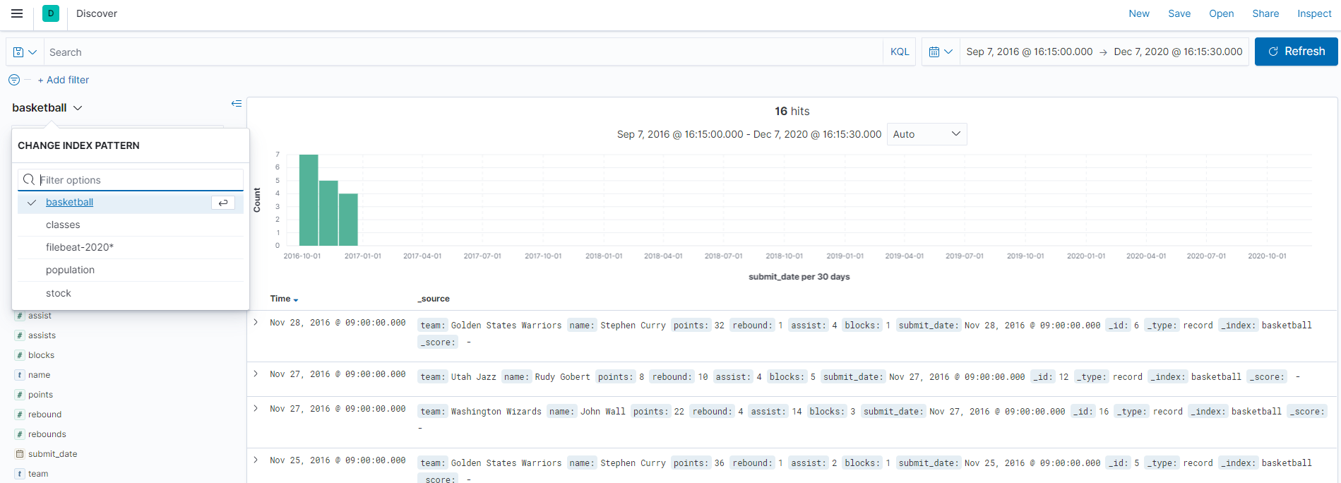 - Index Pattern을 입력한 Basketball로 바꿔줍니다.