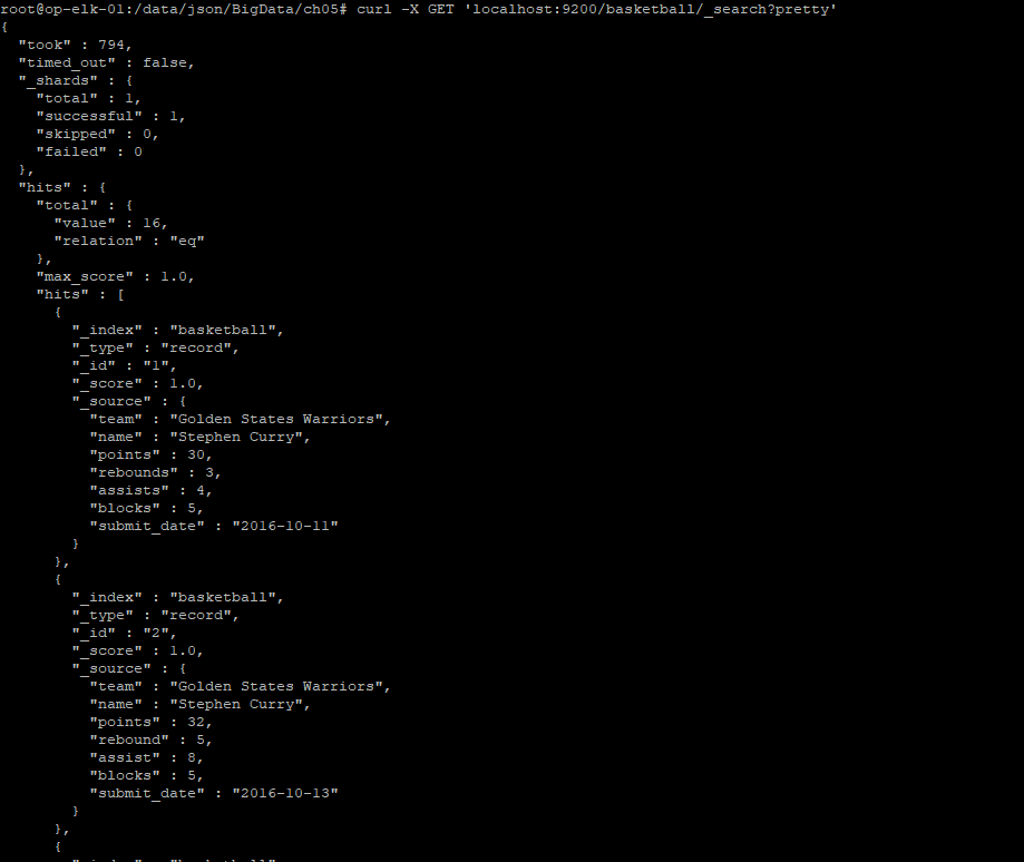 # curl -X GET 'localhost:9200/basketball/_search?pretty'