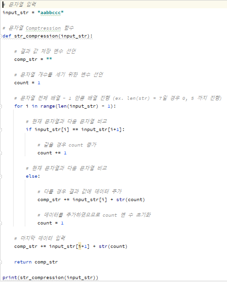 Python 기본 함수들을 이용하여 "aabbccc" 형태의 String을 a2b2c3 형태로 Compression 하는 알고리즘에 대해서 알아보고 코드를 직접 작성하여 데이터 출력을 확인해보도록 하겠습니다.