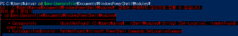 - PC Powershell 모듈 경로가 다른 곳으로 잡혀 있어서 Default 경로인 아래 경로로 설정해주었습니다.