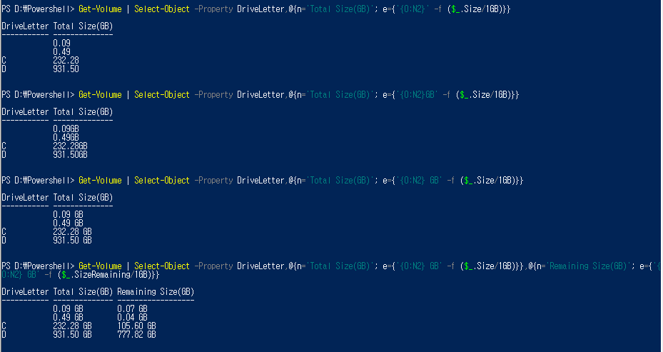 속성 제한 예시 속성 제한 예시 응용 - 1 : {[인덱스 번호]:[적용할 서식][자릿수 지정자]} -f [서식 문자열] ex) @{n='Total Size(GB)'; e={'{0:N2}' -f ($_.Size/1GB)}} // 속성 이름 변경 및 값 Preprocessing