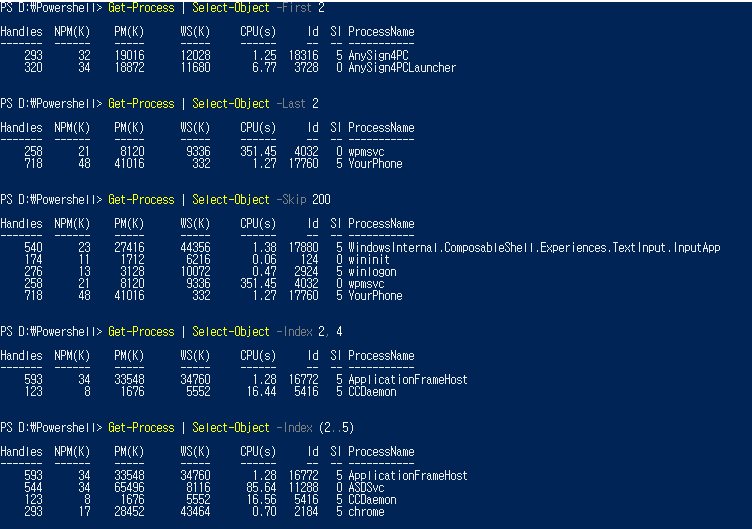 - 명령의 결과 제한 a. -First n: 위에서 부터 n개의 결과 출력 b. -Last n: 아래에서 부터 n개의 결과 출력 c. -Skip n: n개의 데이터 스킵 후 출력 d. -index n1, n2...: 행 번호를 지정하여 결과 출력 e. -index (n1..n2): 두 개의 행 번호를 지정하여 범위 출력