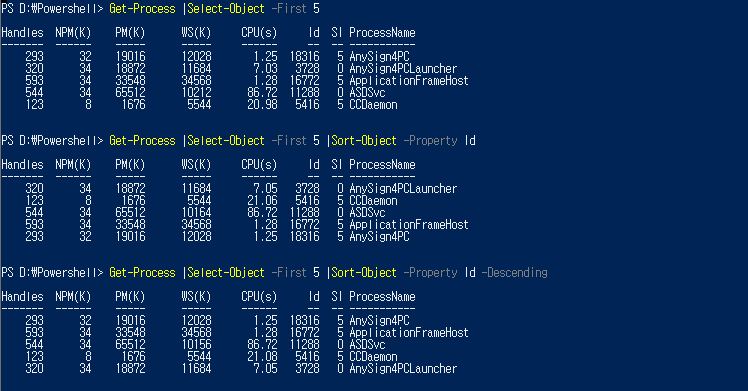 - 개체 정렬(Sort-Object) a. -Property: 개체 이름으로 정렬 b. -Descending: 정렬 순서를 내림 차순으로 변경 (Default 오름 차순) c. -CaseSensitive: 정렬 시에 대소문자를 구분함