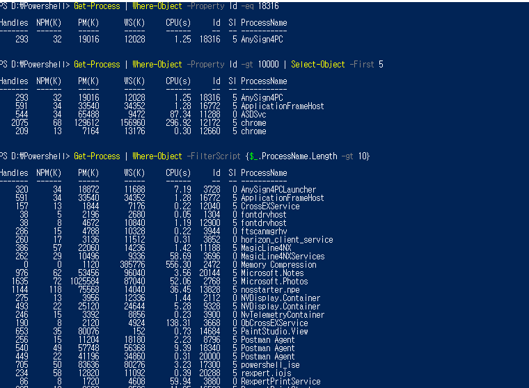 - 개체 필터링(Where-Object) a. -Property: 기본 필터로 사용하려는 개체 속성을 지정. 하나의 속성만 지정 가능 b. -Value: 속성의 값을 지정 c. -FilterScript: 고급 필터로 사용하는 스크립트를 지정