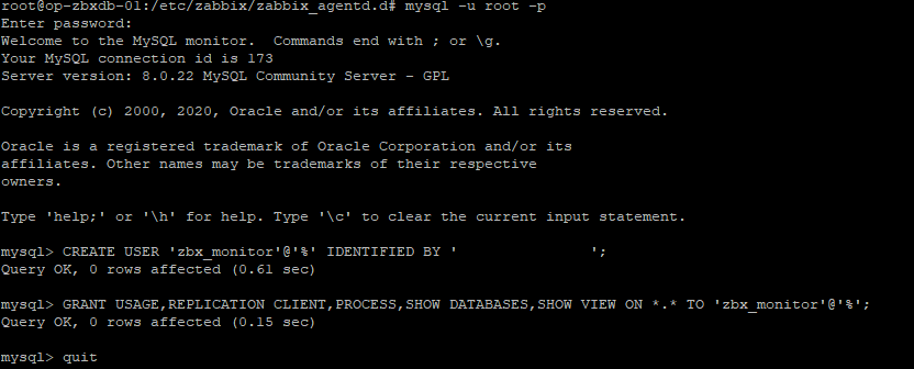 > GRANT USAGE,REPLICATION >CLIENT,PROCESS,SHOW DATABASES,SHOW VIEW ON *.* TO 'zbx_monitor'@'%';