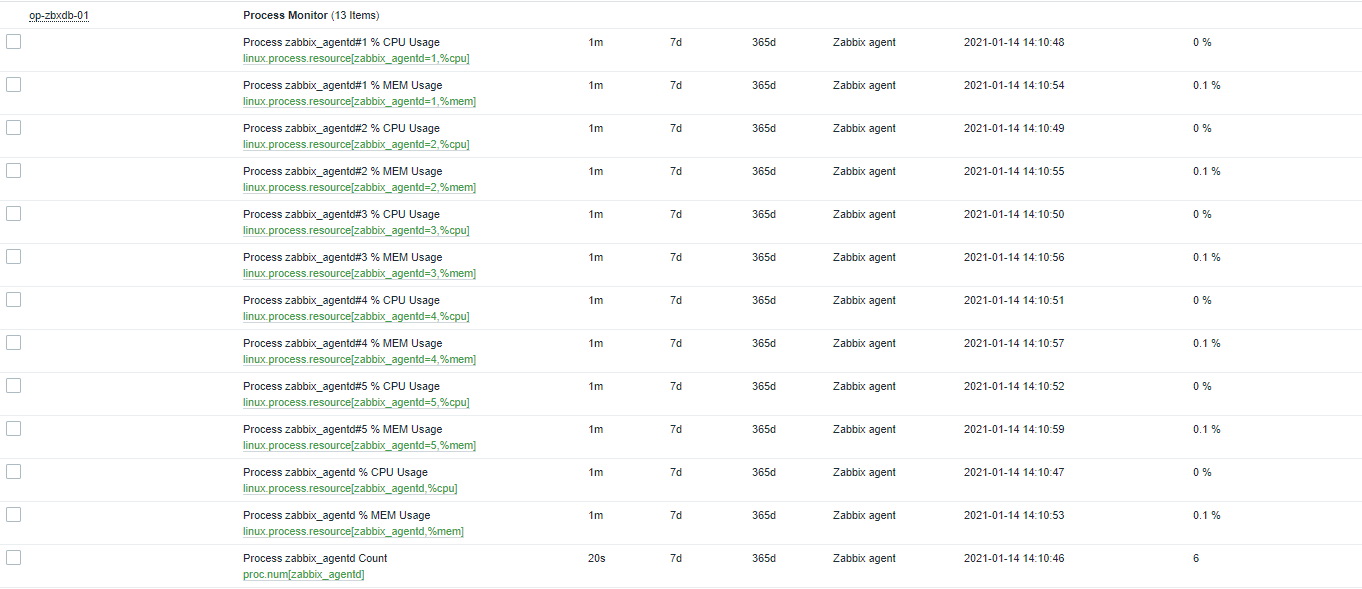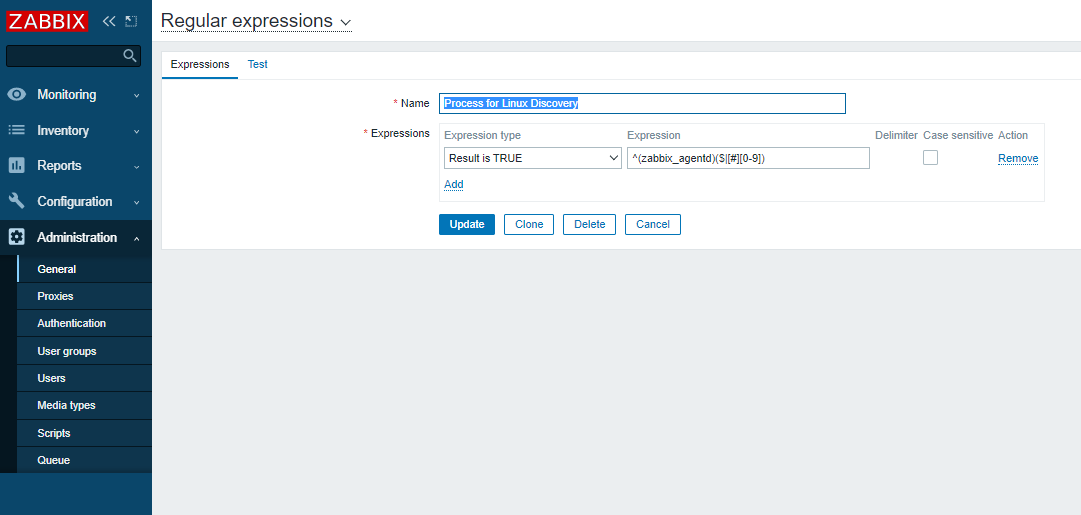 - 정규표현식 추가 - Administration->General->Regular expressions : Name: Process for Linux Discovery : Expressions: ex) ^(zabbix_agentd)($|[#][0-9]) [Result is TRUE]