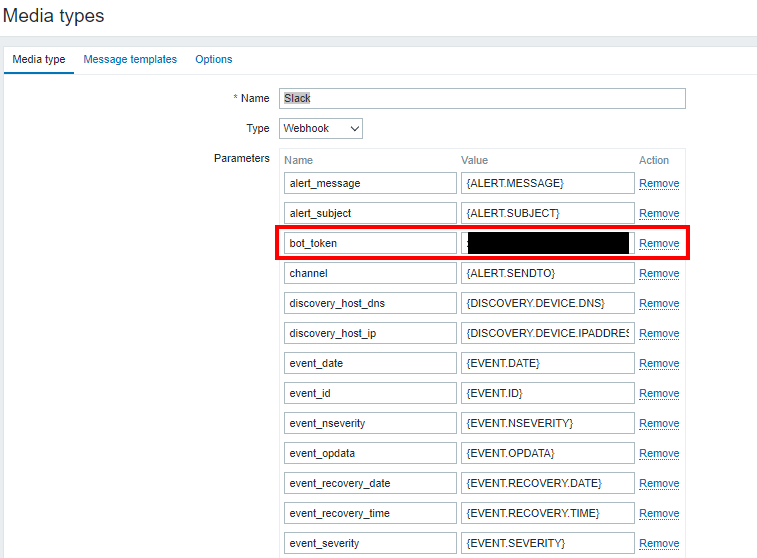 - 아래의 토큰 정보를 나중에 Zabbix Media 설정 시 사용할 것이므로 메모장 같은 곳에 복사해 둡니다.