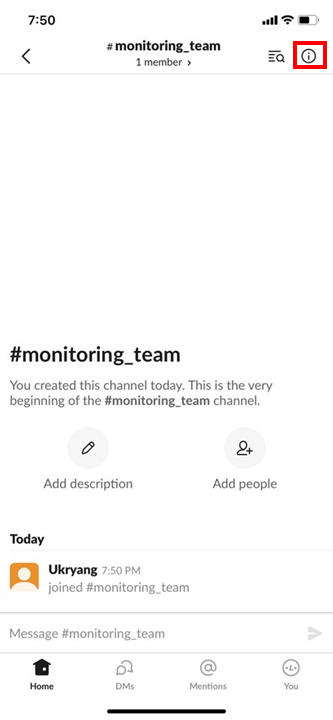 - 채널 생성이 완료되면 오른쪽 위의 i 버튼을 눌러줍니다.