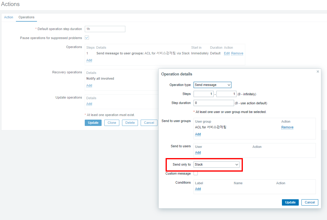- 아래와 같이 Action을 생성해준 후 Alert을 받을 Conditions를 설정해준 후 Operation에 Slack을 연동시킵니다.