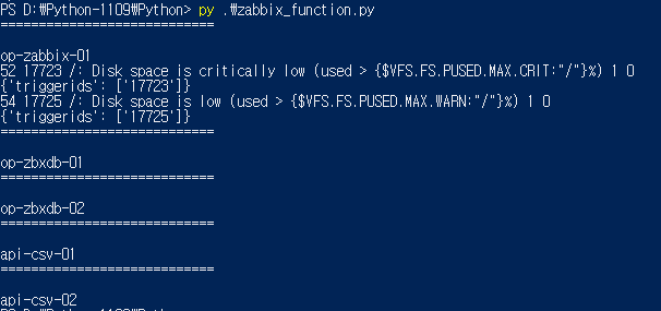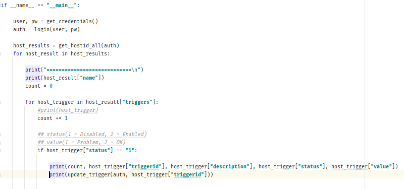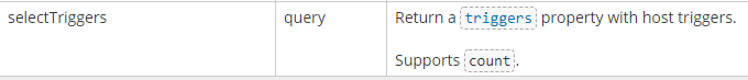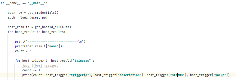 - 우선적으로, 전체 Host의 Trigger 목록을 출력해보았습니다. - host.get 함수 사용 - select.Triggers 옵션을 활성화 시켜주었습니다.