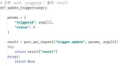 - trigger.update 함수 사용 : triggerid로 필터링 후 status 값을 변경해줍니다.