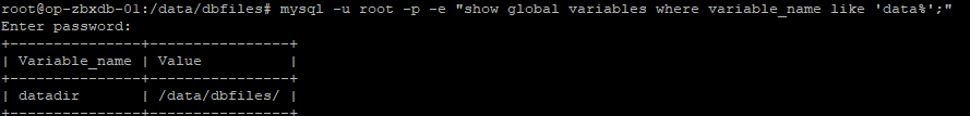 # mysql -u root -p -e "show global variables where variable_name like 'data%;'