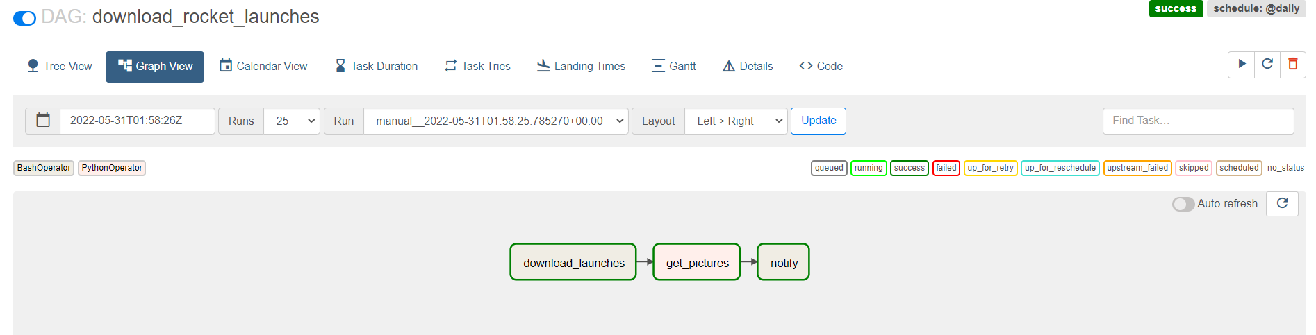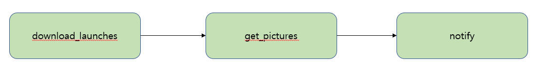 'download_lauches' task가 먼저 실행이 되며, 해당 task가 정상적으로 실행되어야 'get_pictures' task가 실행되며 위와 같이 순차적으로 task들이 실행이 되며, 사용자는 이러한 종속성에 맞게 DAG안에 task들을 다양한 Operator들을 통해 정의하게 되며 Python, Yaml, Bash 등 여러 가지 언어가 사용 가능하므로 복잡한 task들의 조합을 통해 효율적인 데이터 파이프라인을 구성할 수 있습니다.